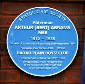 Although Bert Abrams resided in Portishead, we opted to place the plaque in a more appropriate location – a suburb where he contributed so much – Knowle West. In 2021, plans were approved to demolish an unused part of the Broad Plain House youth club in Broadbury Road to make way for 47 new affordable homes. We approached the developer Curo Group and they were eager to assist us. The entrance to the original building was flanked by tall brick pillars; these have been reinstated and one of the pillars provides a splendid pedestal for the plaque.